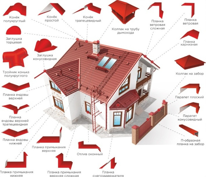 Конёк кровельный Ендова Планка примыкания Планка карнизная Планка торцевая Планка угла внутреннего Планка угла наружного Лобовая планка Нащельники Колпак на забор Дымник на трубу Парапет кровельный Снегозадержатель Отливы оконные Нащельники для сэндвич-панелей Комплект доборов на крышу Доборы по чертежу Костыли кровельные Фасонные изделия Французские грядки Планка примыкания дымохода Полимерная покраска металла Капельник Планка ветровая