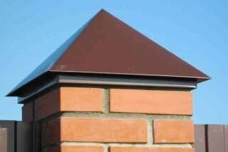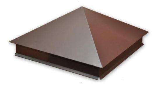 Верхняя часть колпака с наклонным капельником на основании имеет классическую форму, а водоотлив на юбке надежно отводит воду от столба. Это одна из наиболее популярных моделей заборных колпаков из оцинкованной стали.